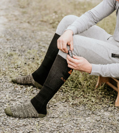 Sockan är knähög och värmer skönt hela vägen upp tack vare mjuk och värmande merinoull. Det bästa med ullen är att den värmer även om du skulle bli fuktig om fötterna.